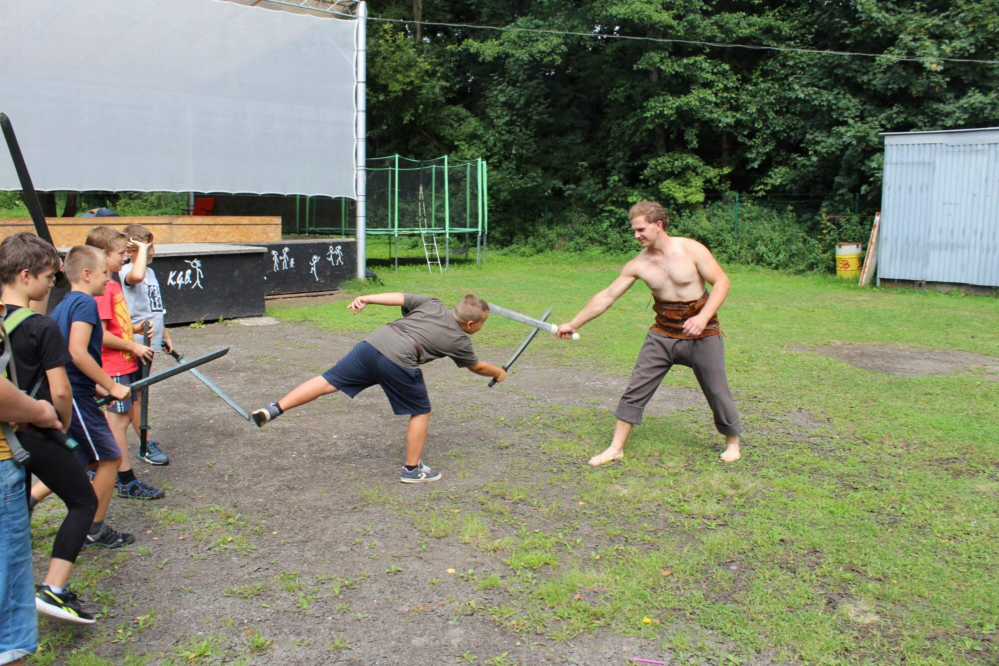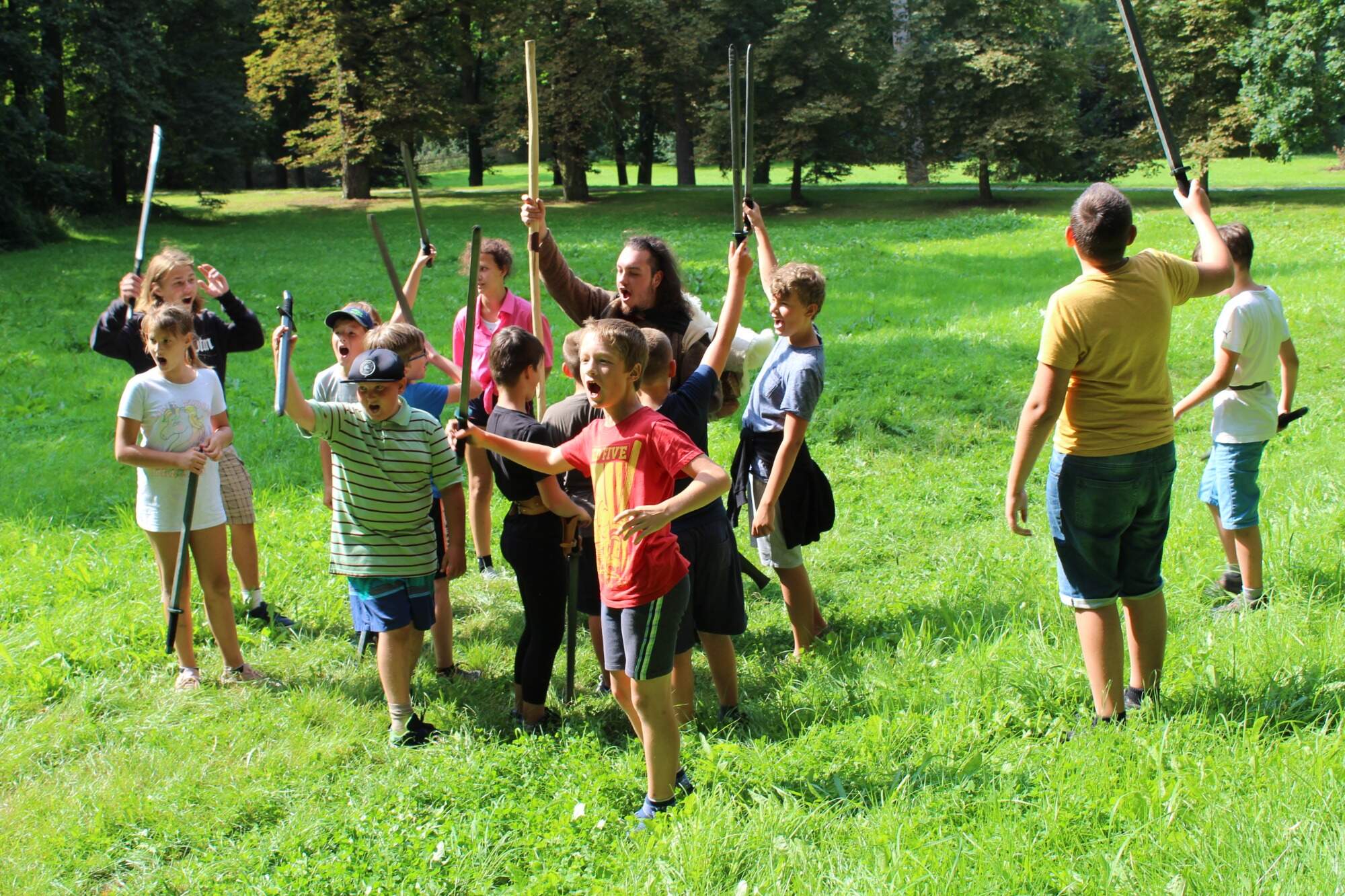 Škola šermu je dobrodružný pětidenní příměstský tábor s více než desetiletou tradicí. Chlapci i dívky se během týdne přesunují do historických událostí ale i fantastických světů. Letos se tábor nesl v duchu Starých pověstí českých. Na výpravě dějinami raného středověku děti poznaly, jak se žilo obyčejnému lidu i mocným panovníkům. Setkaly se s dávnými postavami, které známe z pověstí a legend, ale i s těmi, na které historické knihy již zapomněly. Díky kostýmům, kulisám, rekvizitám, a hlavně příběhu děti prožily kapitoly z